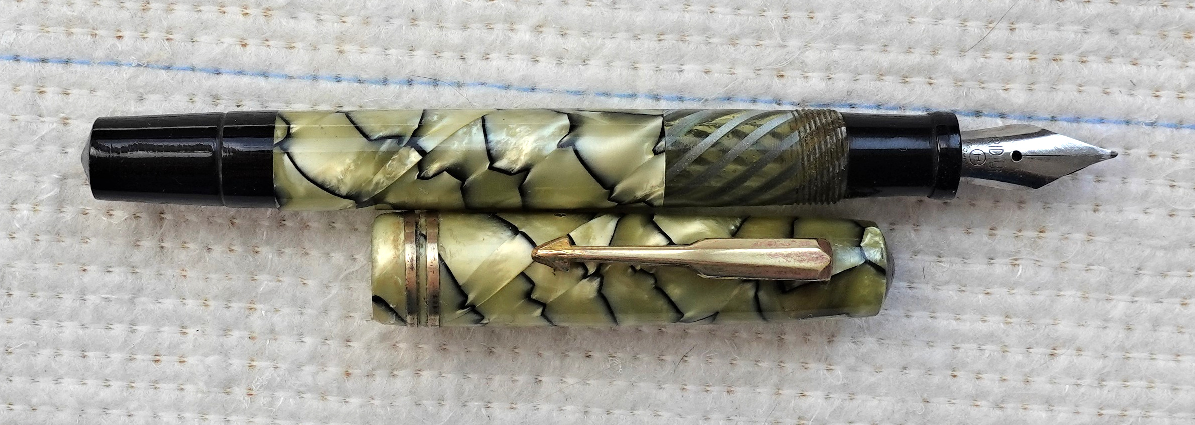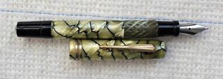 Photo of a pen produced by Helios marked "Helios - Silga". Filling system: piston filler. In cracked ice (black veined pearl) celluloid. Unidentified model, from italian production by Silga.