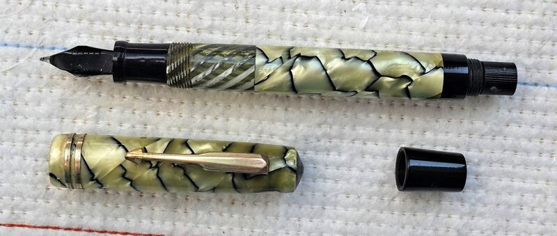 Photo of a pen produced by Helios marked "Helios - Silga". Filling system: piston filler. In cracked ice (black veined pearl) celluloid. Unidentified model, from italian production by Silga.