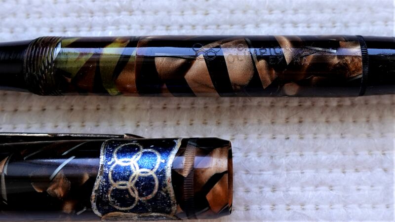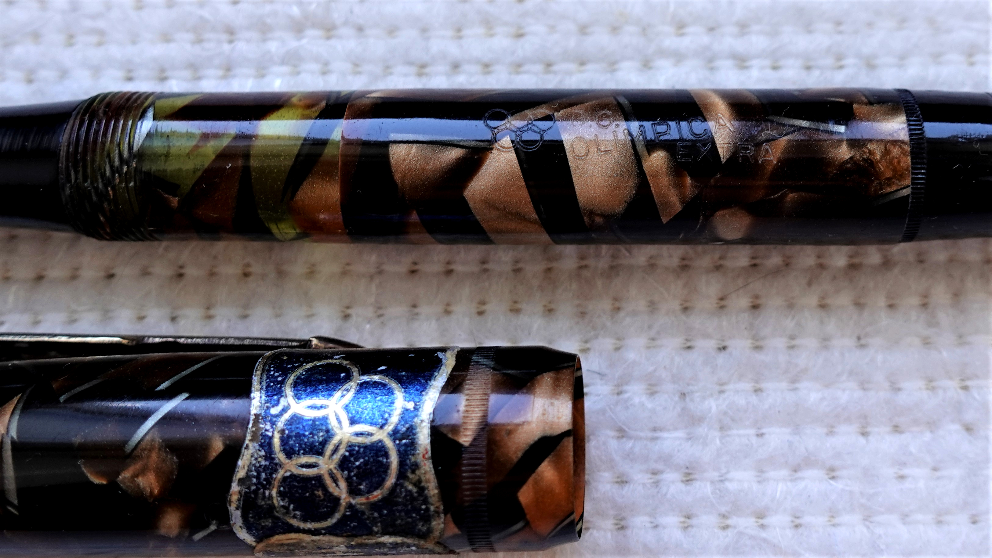 Foto di una penna Olimpica (un marchio della Giacomazzi). Caricamento a stantuffo. Realizzazione in celluloide marmorizzata marrone con strisce crema. Dettaglio della stampigliatura. Dettaglio della fascetta. Modello ignoto con clip a freccia. Contributo di Andrea (utente forum bisguillo).
