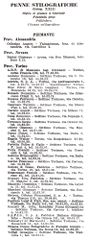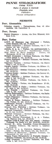 A page scanned from a yearbook dated 1956. Extract from: "Annuario generale dell'industria e del prodotto italiano", published by "Satet - Torino" and compiled by "Confederazione generale dell'industria italiana". Concerning companies: Alfa-Ro, Ancora, A.B.T., Aurora, Blue River, Surgens, Goldmichel, Williamson, Pagliero, Titania, SAFIS, Teknostyl, Goldmichel, Giacomazzi, Wilson, Alfa e Tiziana Record. First page about fountain pen manufactures. Some brands are referred to by name of the owner company by other sources, in particular: Zanini Giuseppe for the Ancora, Angelo Cavallo for the Surgens, Engele Walter for the Goldmichel, Metron for the Williamson, Roccati M. for the Alfa-Ro, Toffali Giuseppe for the Wilson. Other owners mentioned: Cellerino Angelo, Massucco Giovanni (A.B.T.), Audano Domenico, Mario Baggiani (Blue River), Bonadè Domenico, Busana Ferruccio, Canevaro Turiddu, Cena Domenico, Cernusco Sergio, Chicco Giacomo, Cucco Pietro, Favetta Felice (Alfa), Frola Fratelli, Gallone Ermenegildo, Garino Francesco, Genoso & Rosso, Ginepro Elia, Manzetti Domenico, Marchesi Giuseppe, Pagliero Luigi & Figli (Pagliero), Martinotti (Teknostyl), Fornello Giorgio (Titania), Pietro Cucco (Tiziana Record).