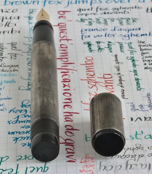 Photo of a pen produced by Whytwarth. Filling system: safety. With with guilloché bands sterling silver overlay. Safety model, perhaps the Scientific Unleakable, Valentine nib, bears the nº GB-185512 patent stamped on it.