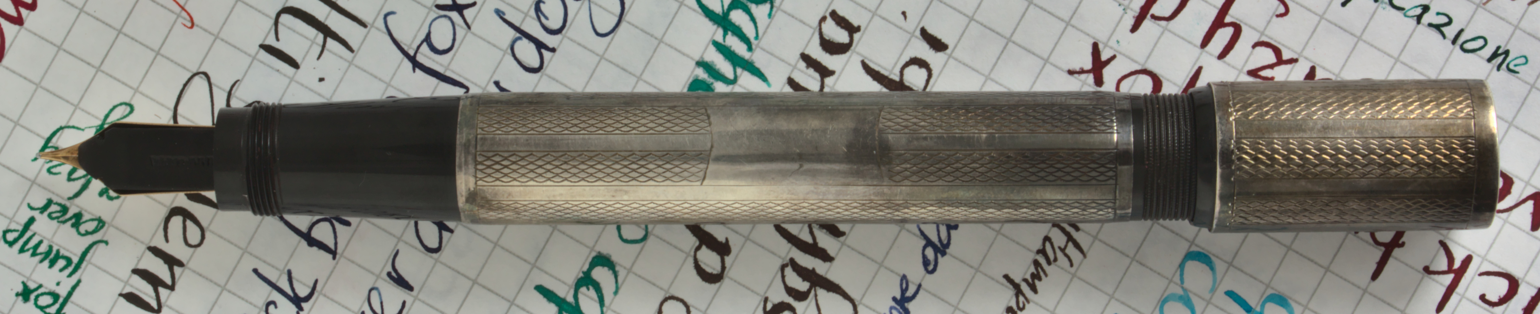 Photo of a pen produced by Whytwarth. Filling system: safety. With with guilloché bands sterling silver overlay. Safety model, perhaps the Scientific Unleakable, Valentine nib, bears the nº GB-185512 patent stamped on it.