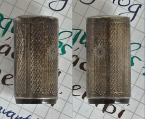 Photo of a pen produced by Whytwarth. Filling system: safety. With with guilloché bands sterling silver overlay. Detail of cap. Safety model, perhaps the Scientific Unleakable, Valentine nib, bears the nº GB-185512 patent stamped on it.