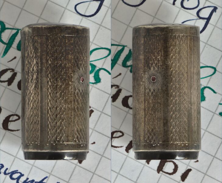 attuale23:51, 15 ago 2023Miniatura della versione delle 23:51, 15 ago 20233 404 × 2 800 (1,6 MB)Piccardi (discussione | contributi)== Dettagli == {{PhotoInfo |Marca=Whytwarth |Oggetto=pen |Particolare=cap |Caricamento=safety |Materiale=silver |MatDesc_it=con bande guilloché |MatDesc_en=with guilloché bands |Licenza=Cc-by-sa-3.0 |Note_it=Modello rientrante, forse la ''Scientific Unleakable'', pennino della Valentine, riporta stampigliato il brevetto {{Cite_patent|GB|185512}}. |Note_en=Safety model, perhaps the ''Scientific Unleakable'', Valentine nib, bears the {{Cite_patent|GB|185512}} patent stamped on i...