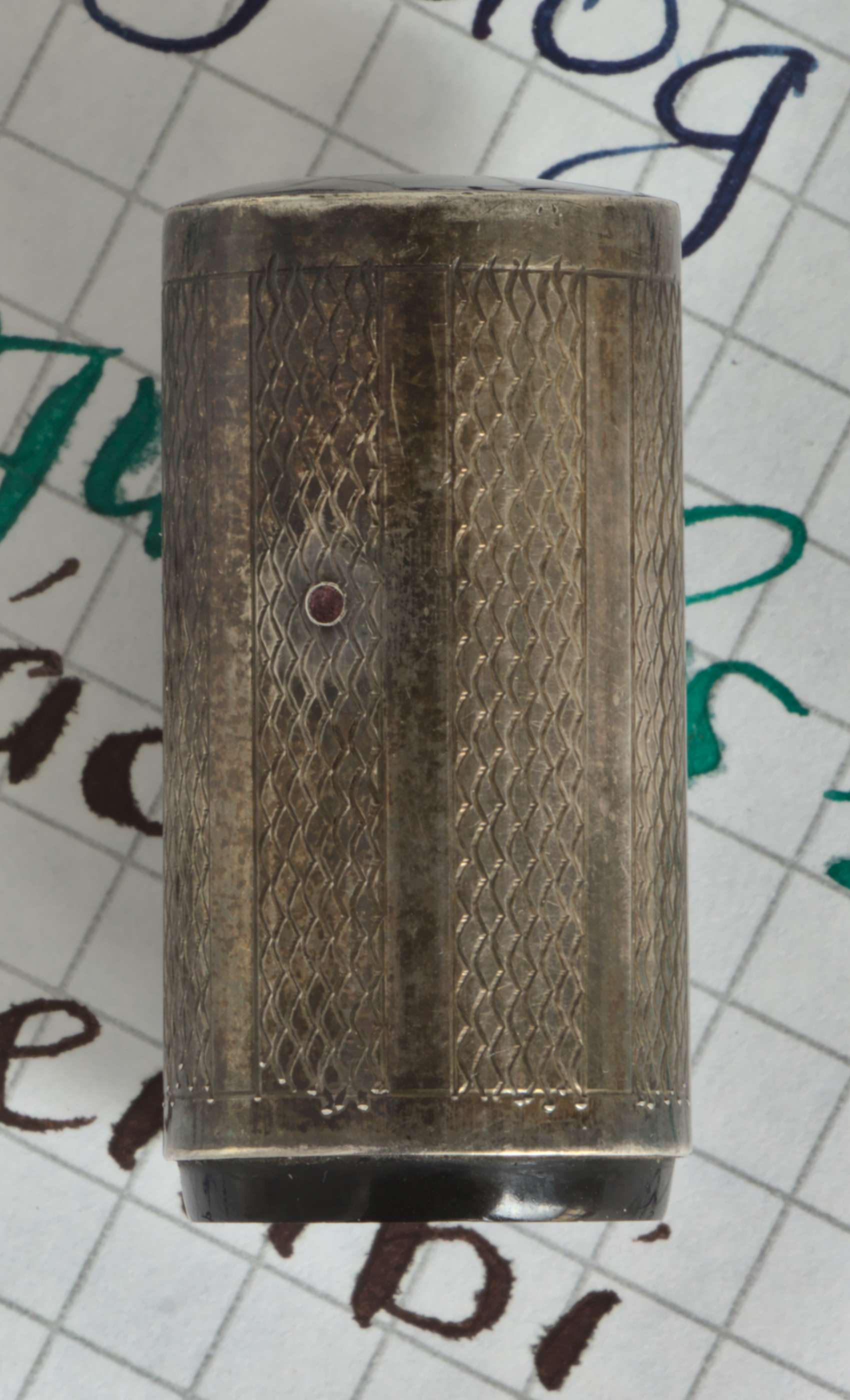 Photo of a pen produced by Whytwarth. Filling system: safety. With with guilloché bands sterling silver overlay. Detail of cap. Safety model, perhaps the Scientific Unleakable, Valentine nib, bears the nº GB-185512 patent stamped on it.