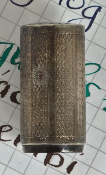 | attuale | 23:52, 15 ago 2023 | 1 700 × 2 800 (1 022 KB) | Piccardi (discussione | contributi) | == Dettagli == {{PhotoInfo |Marca=Whytwarth |Oggetto=pen |Particolare=cap |Caricamento=safety |Materiale=silver |MatDesc_it=con bande guilloché |MatDesc_en=with guilloché bands |Licenza=Cc-by-sa-3.0 |Note_it=Modello rientrante, forse la ''Scientific Unleakable'', pennino della Valentine, riporta stampigliato il brevetto {{Cite_patent|GB|185512}}. |Note_en=Safety model, perhaps the ''Scientific Unleakable'', Valentine nib, bears the {{Cite_patent|GB|185512}} patent stamped on i... |