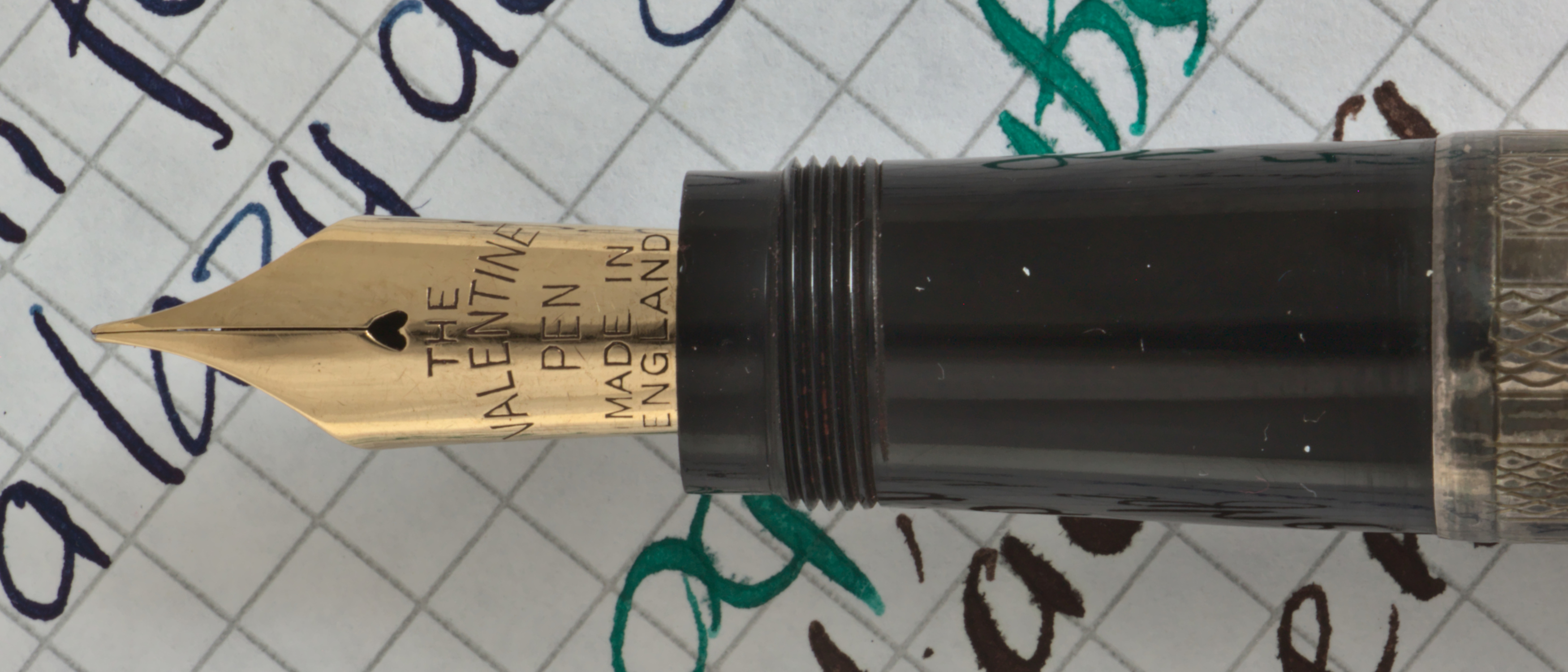 Photo of a pen produced by Whytwarth. Filling system: safety. With with guilloché bands sterling silver overlay. Detail of nib. Safety model, perhaps the Scientific Unleakable, Valentine nib, bears the nº GB-185512 patent stamped on it.