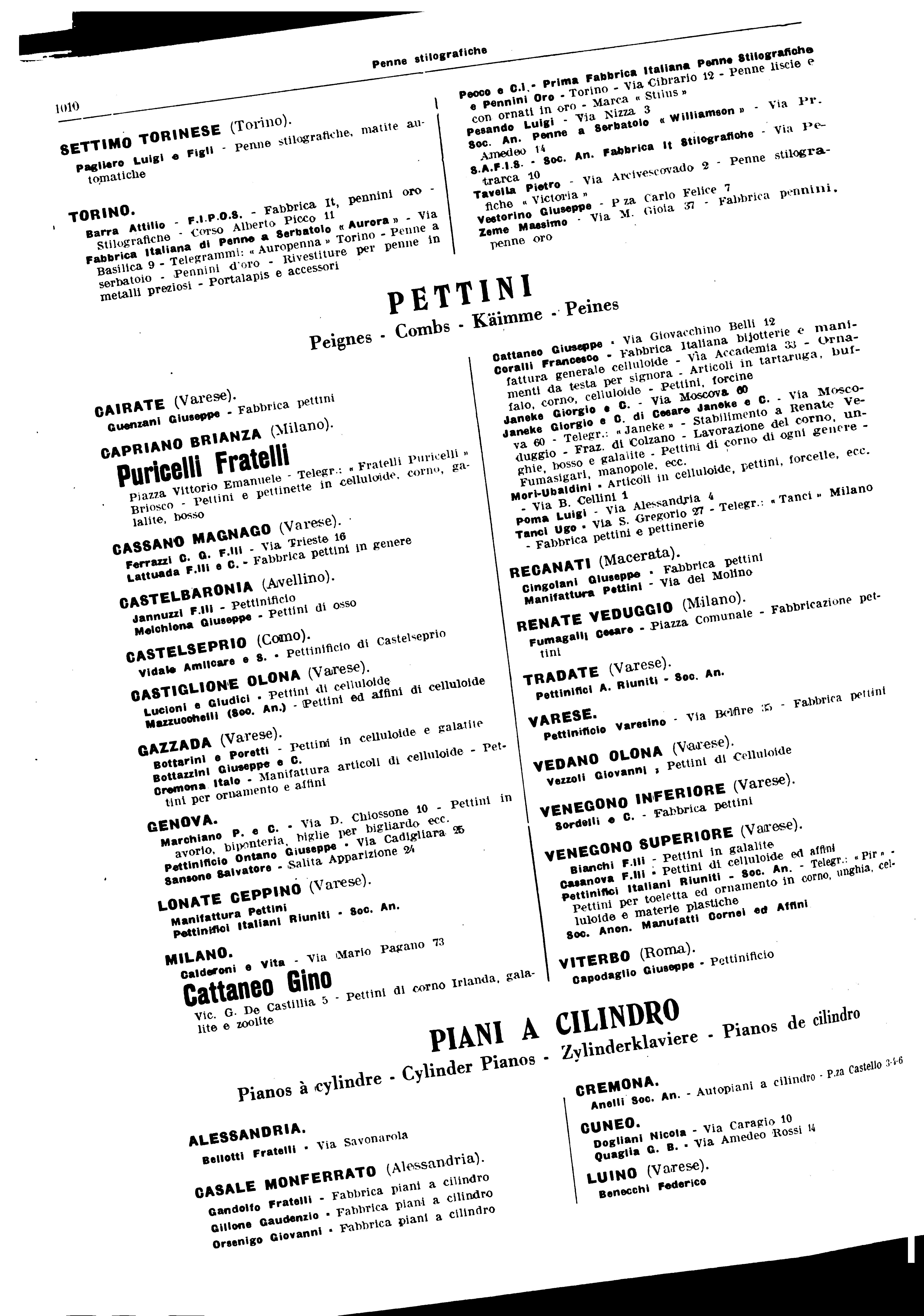 A page scanned from a yearbook dated 1935. Extract from: "Annuario industriale della provincia di Milano", year 1935 (pag. 1010), published by "S. A. Stampa Periodica Italiana". Concerning companies: Pagliero, F.I.P.O.S., Aurora, Stilus, Williamson, S.A.F.I.S., Victoria e Zemax. Page of section for Fountain Pens and Nibs. List as producers: