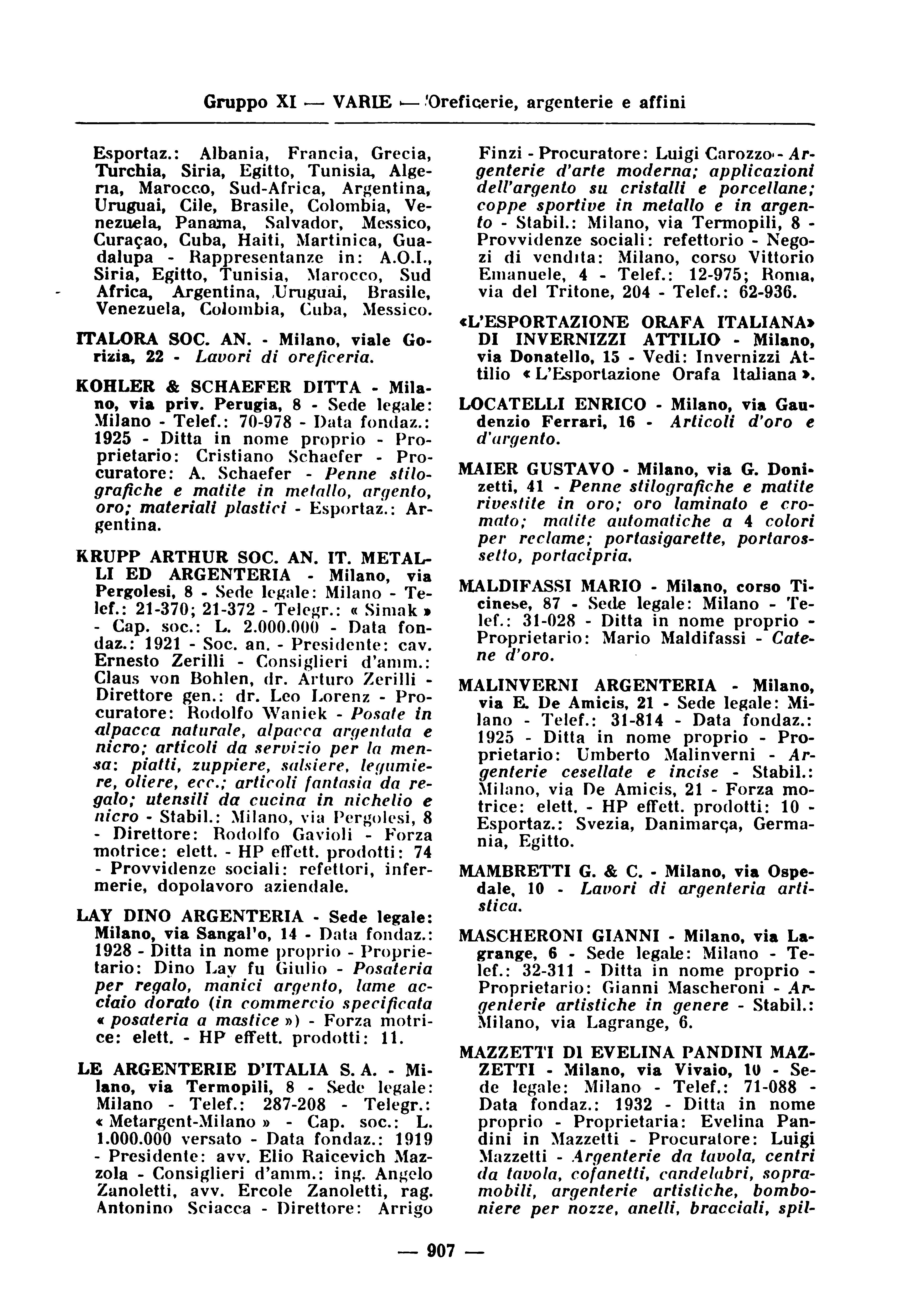 A page scanned from a yearbook dated 1939. Extract from: "Annuario industriale della provincia di Milano", year 1939 (pag. 907), published by "Unione fascista degli industriali di Milano". Concerning companies: Kosca e Ma-Gus. Fourth page of section for "goldsmiths, silversmiths and related products". It lists the companies: