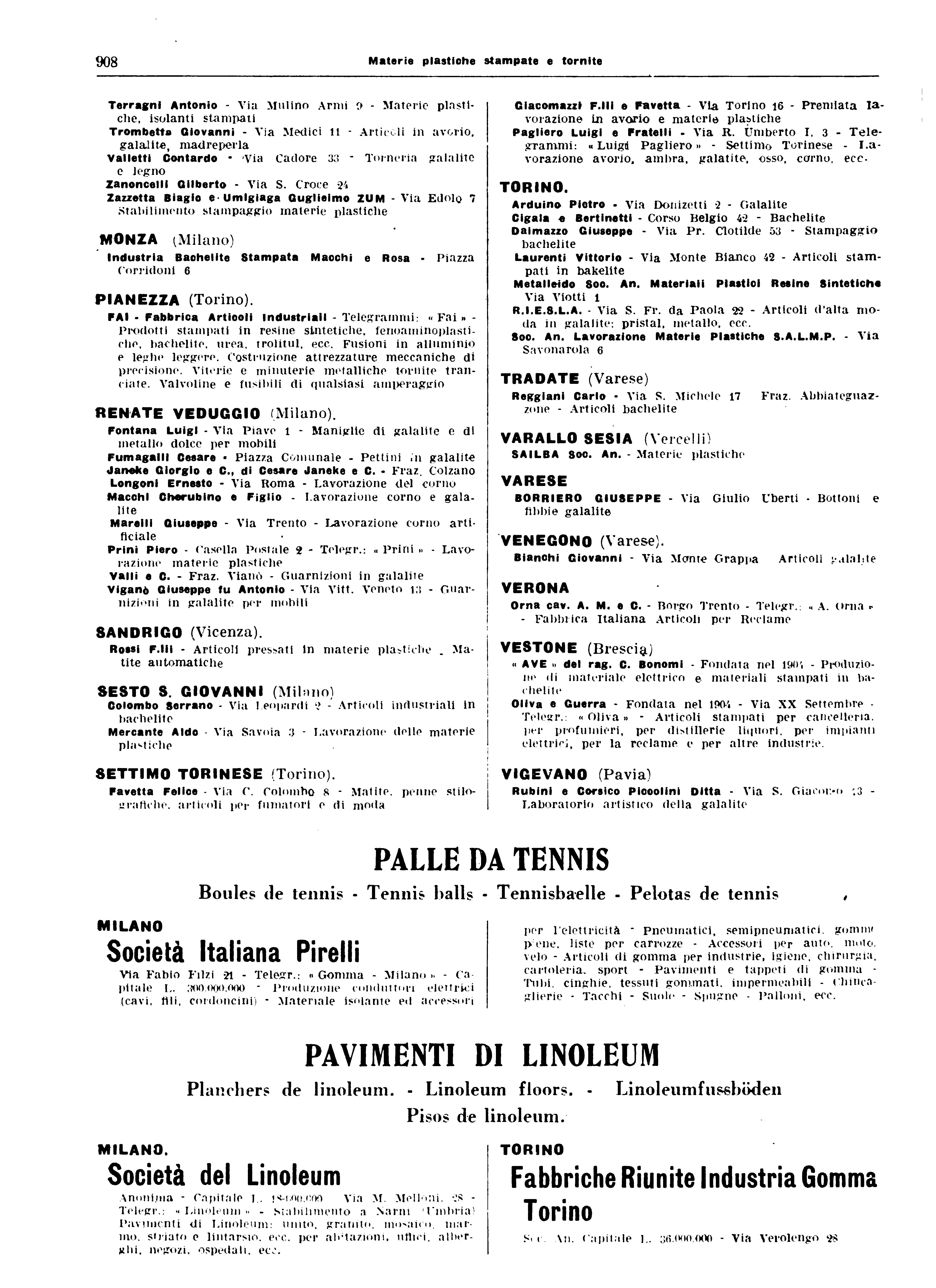 A page scanned from a yearbook dated 1939. Extract from: "Annuario Politecnico Italiano", year 1939 (pag. 908), published by "S. A. Stampa Periodica Italiana". Concerning companies: Fratelli Rossi Vicenza, Alfa, Giacomazzi, Pagliero e Orna. Page of section for "Printed and turned plastical materials". It lists the companies: