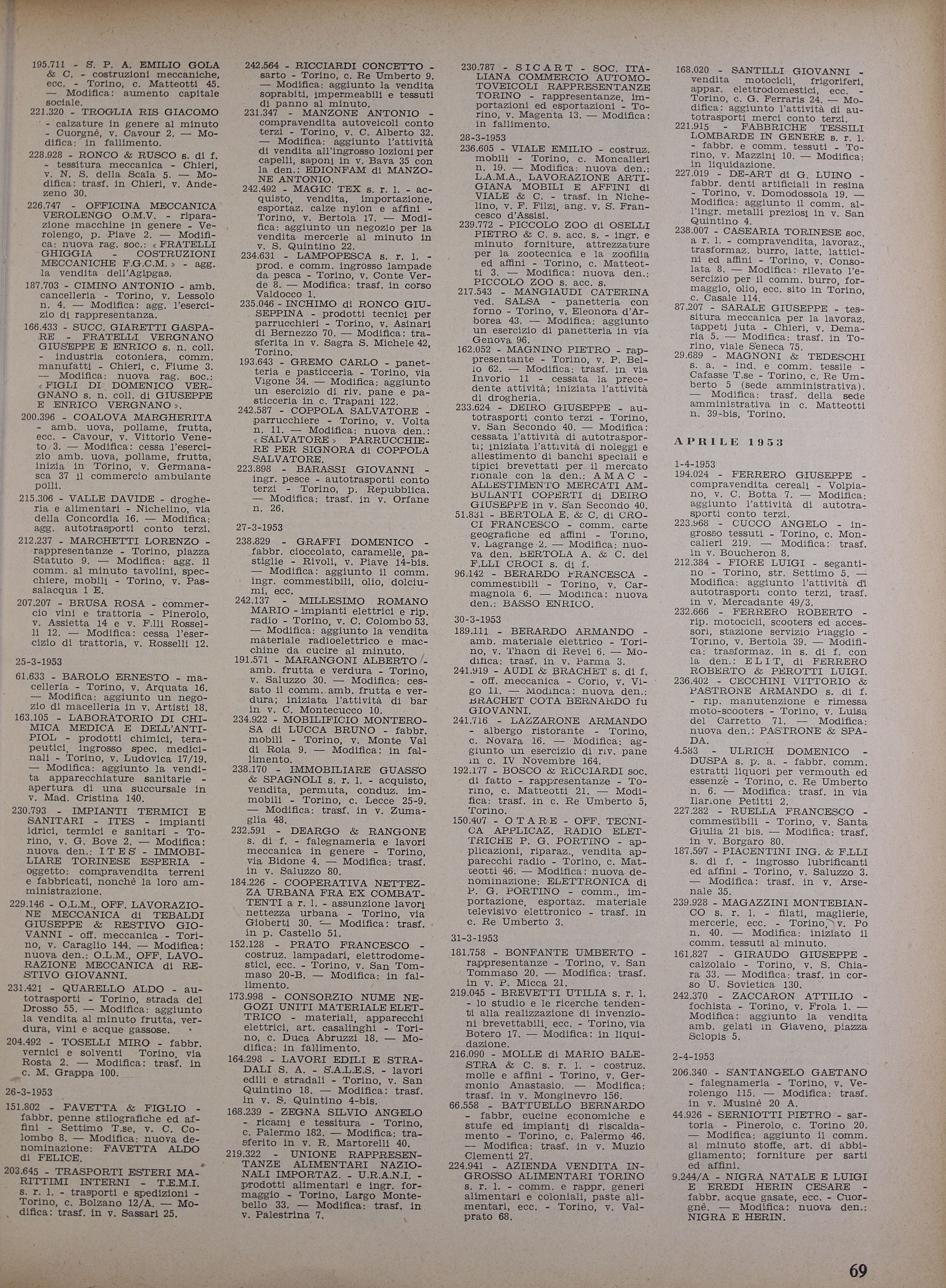 A page scanned from a magazine dated 1953-04. Extract from: "Cronache Economiche", vol. 124, (pag. 69), published by "Camera di Commercio industria e Agricoltura di Torino". Concerning companies: Alfa. Page of "Registry Movement" section, March 1953, "Changes" subsection. Reports on 1953-03-26 at n. 151.802: "FAVETTA & FIGLIO", (see Alfa), for "fabbr. penne stilografiche ed affini", Settimo Torinese, via C. Colombo 8. Change: new name: "FAVETTA ALDO di FELICE".