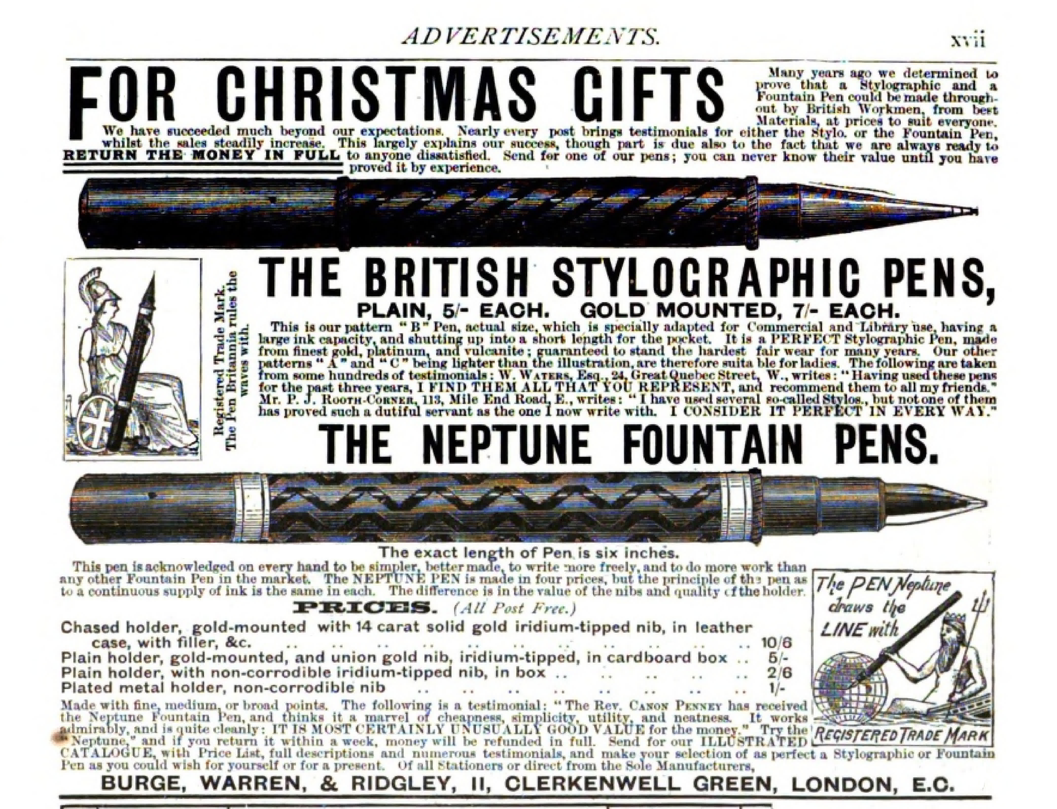 Scansione di una pubblicità Neptune datata 1892. Pubblicazione su: The Strand Magazine - An Illustrated Monthly, vol. III (Jul-Dec), pag. xxii. Indica come indirizzo: "11, Clerkenwell Green, London, E.C.". Data dal reperimento della pagina su una versione archiviata della rivista. Pubblicità della "Burge, Warren & Ridgley" per delle penne a stilo chiamate genericamente British Stylographic Pens e per una stilografica Neptune.