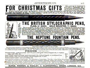 Scanning of advertising from Neptune dated 1892. Published on: The Strand Magazine - An Illustrated Monthly, vol. III (Jul-Dec), pag. xxii. Mention as address: "11, Clerkenwell Green, London, E.C.". Dating established by finding the page in an archived version of the magazine. Advertising from "Burge, Warren & Ridgley" for stylus pens generically called British Stylographic Pens and for a Neptune fountain pen.