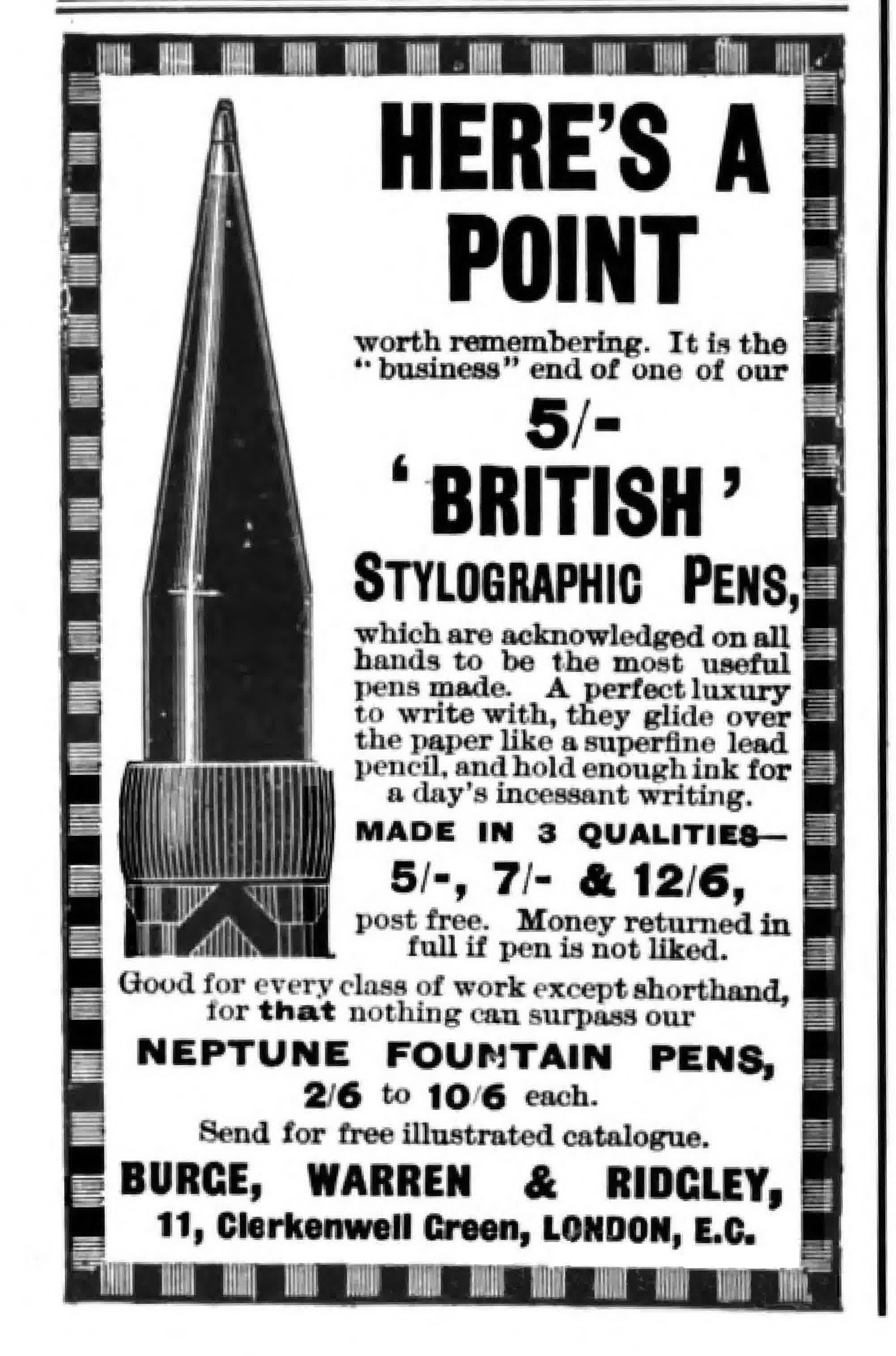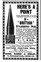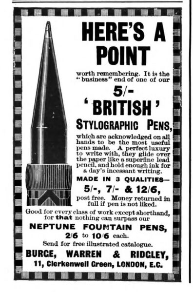 Scanning of advertising from Neptune dated 1896. Published on: The Strand Magazine - An Illustrated Monthly, vol. XII (Jul-Dec), pag. v. Refers to the company as: "Burge, Warren & Ridgley". Mention as address: "11, Clerkenwell Green, London, E.C.". Dating established by finding the page in an archived version of the magazine. Second half of the year. Published also on vol. XIII (Jan-Jun 1897), pag. xviii. Advertising for stylus pens called British Stylographic Pens, mention some Neptune fountain pen.