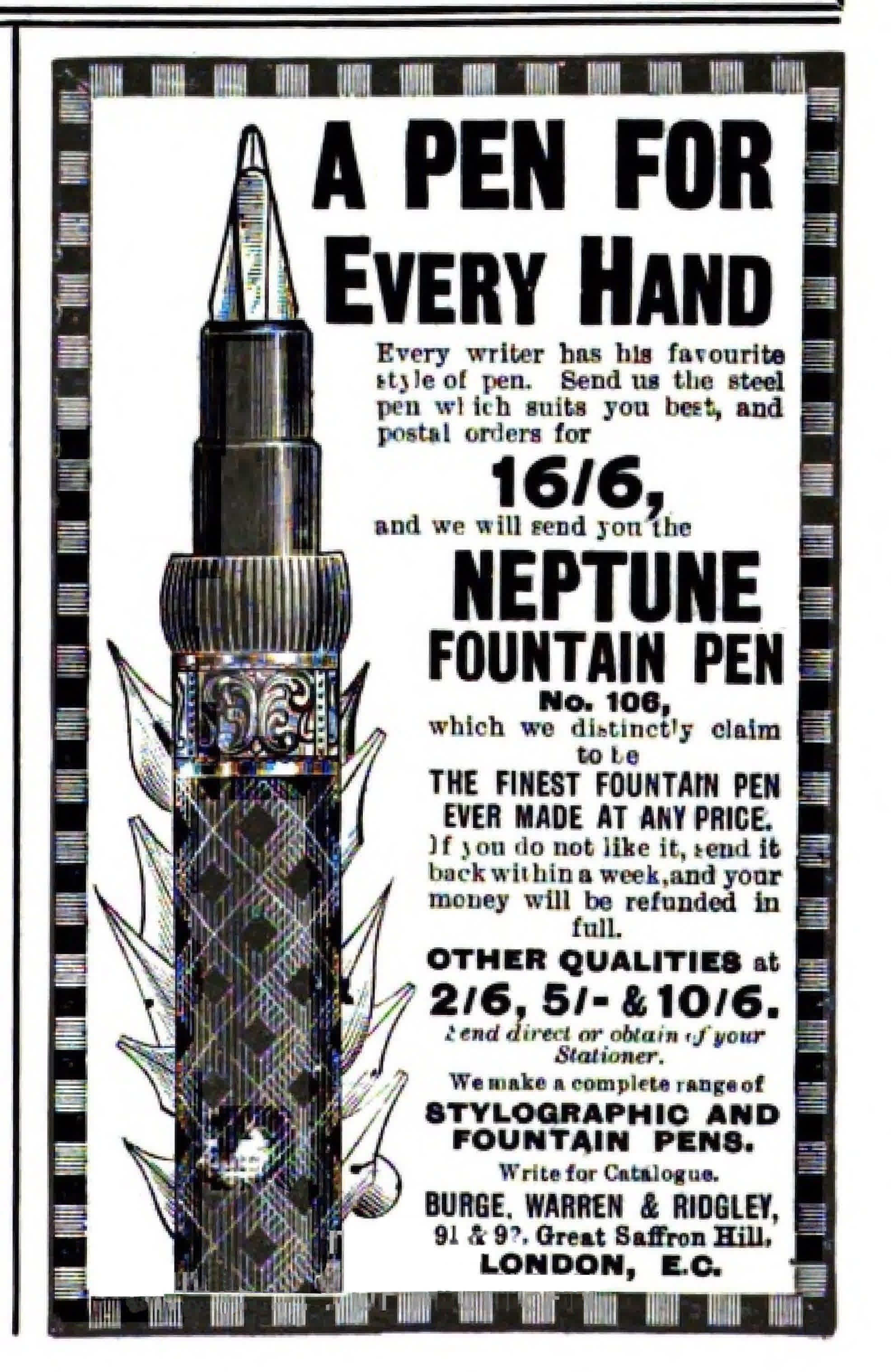 Scanning of advertising from Neptune dated 1898. Published on: The Strand Magazine - An Illustrated Monthly, vol. XVI (Jul-Dec), pag. xvii. Refers to the company as: "Burge, Warren & Ridgley". Mention as address: "91 & 92, Great Saffron Hill, London, E.C.". Dating established by finding the page in an archived version of the magazine. Second half of the year. Advertising for the Neptune fountain pens.