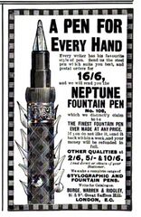 Scansione di una pubblicità Neptune datata 1898. Pubblicazione su: The Strand Magazine - An Illustrated Monthly, vol. XVI (Jul-Dec), pag. xvii. Riferimento all'azienda come: "Burge, Warren & Ridgley". Indica come indirizzo: "91 & 92, Great Saffron Hill, London, E.C.". Data dal reperimento della pagina su una versione archiviata della rivista. Seconda metà dell'anno. Pubblicità per le stilografiche Neptune.