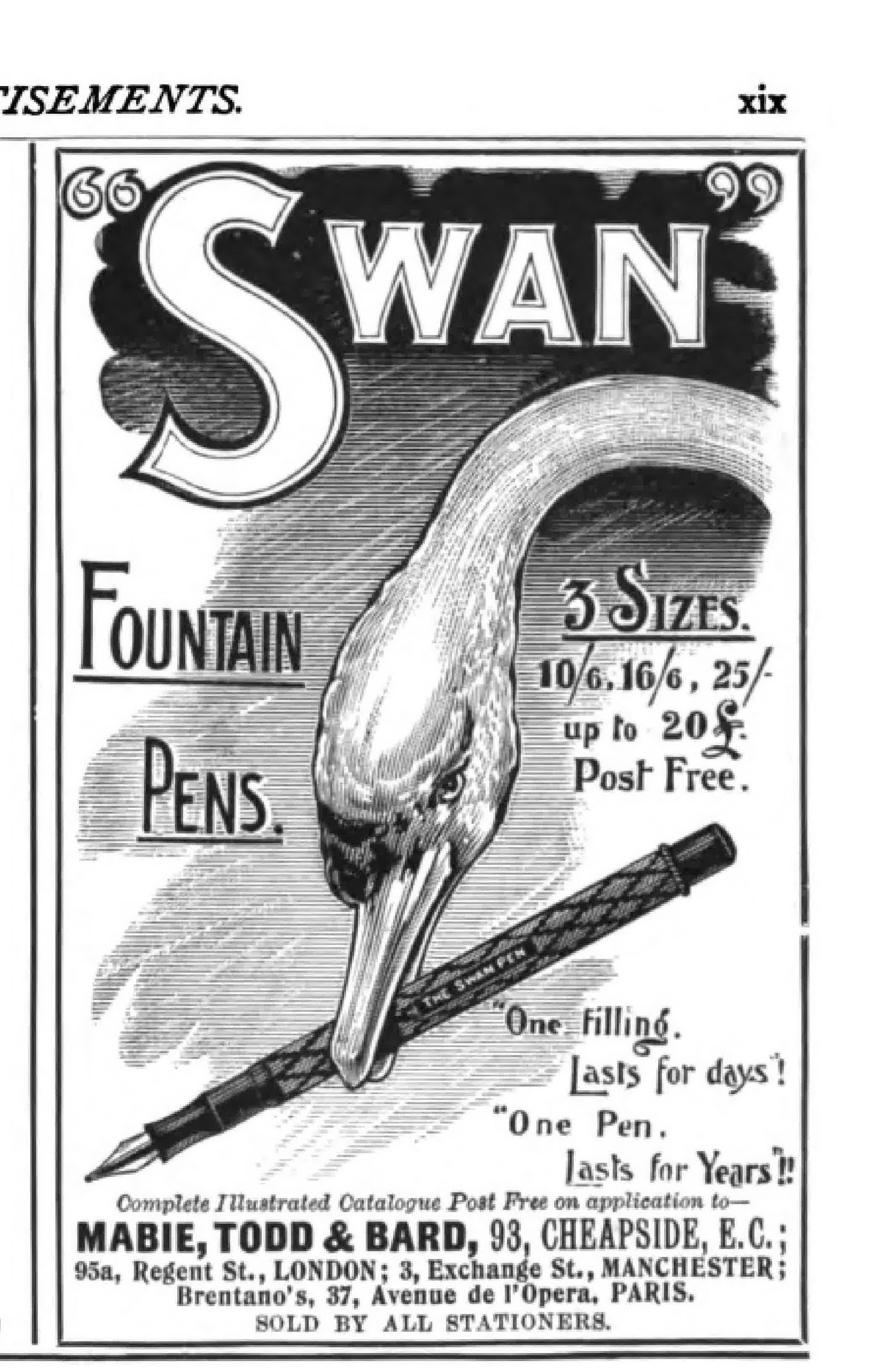 Scansione di una pubblicità Swan datata 1900. Pubblicazione su: The Strand Magazine - An Illustrated Monthly, vol. XIX (Jan-Jun), pag. vii. Riferimento all'azienda come: "Mabie, Todd, & Bard". Indica come indirizzo: "95a, Regent St. W.; 93, Cheapside, London, E.C". Data dal reperimento della pagina su una versione archiviata della rivista. Prima metà dell'anno. Pubblicità per una stilografica Swan Fountain Pen, indica tre dimensioni prezzate rispettivamente a 10/6, 16/6 e 25/-.