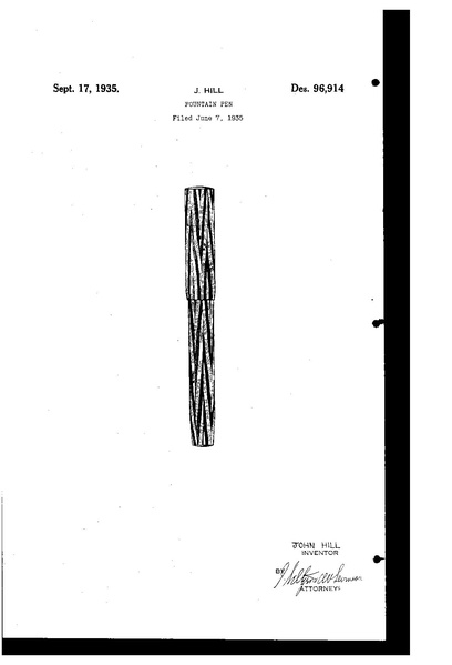 Versione del 19 set 2023 alle 01:09 di Piccardi (discussione | contributi) ({{PatentInfo |Inventor=John Hill |Assignee=Celluloid Corporation |Country=US |ApplicationNum=57179 |ApplicationDate=1935-06-07 |PatentNum=D096914 |PatentDate=1935-09-17 |PriorityDate=1935-04-23 |Titolo=Design for a fountain pen |Marca=Waterman |Descrizione=Celluloide ''"RAY"'' |Tipo=design }} ==Informazioni== Brevetto per la celluloide ''"RAY"'' con il peculiare motivo a strisce incrociate a V di celluloide colorata e nera o semitrasparente usata dalla Waterman per i modelli Ink-Vue e...)