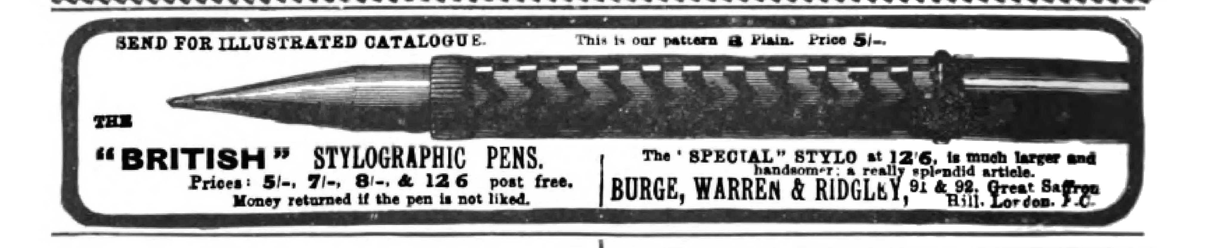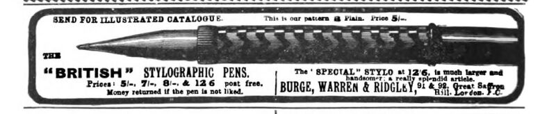 Scanning of advertising from Neptune dated 1901. Published on: The Strand Magazine - An Illustrated Monthly, vol. XXII (Jul-Dec), pag. xii. Refers to the company as: "Burge, Warren & Ridgley". Mention as address: "91 & 92, Great Saffron Hill, London, E.C.". Dating established by finding the page in an archived version of the magazine. Second half of the year. Advertising for stylus pens called British Stylographic Pens