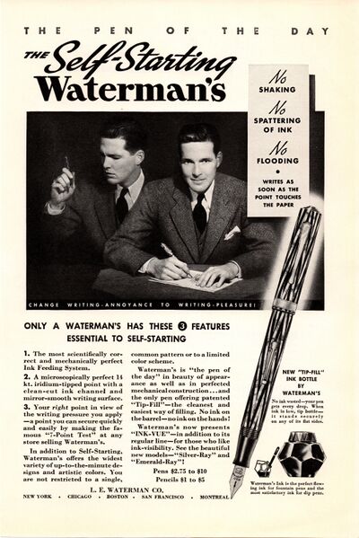 Scansione di una pubblicità Waterman datata 1935-10. Pubblicazione su: The National Geographic Magazine, vol. LXVIII, n. 4. Ritoccata dall'autore per una migliore nitidezza. Contributo di Giorgio (utente forum Musicus). Data dal reperimento della pagina su una versione archiviata della rivista. Pubblicizza il modello No. 7 ed il calamaio Tip-Fill Bottle e cita le nuove Ink-Vue. Cita anche il caricamento Tip-Fill ed i colori Silver-Ray e Emerald-Ray.