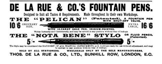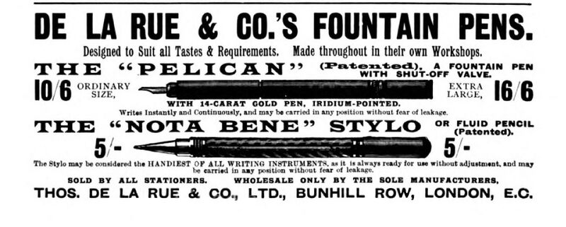 Scanning of advertising from Onoto dated 1901. Published on: The Strand Magazine - An Illustrated Monthly, vol. XXI (Jan-Jun), pag. x. Refers to the company as: "Thos. De La Rue & Co., Ltd.". Mention as address: "Bunhill Row, London, E.C.". Dating established by finding the page in an archived version of the magazine. First half of the year. Advertising for Pelican fountain pen and Nota Bene mechanical pencil.
