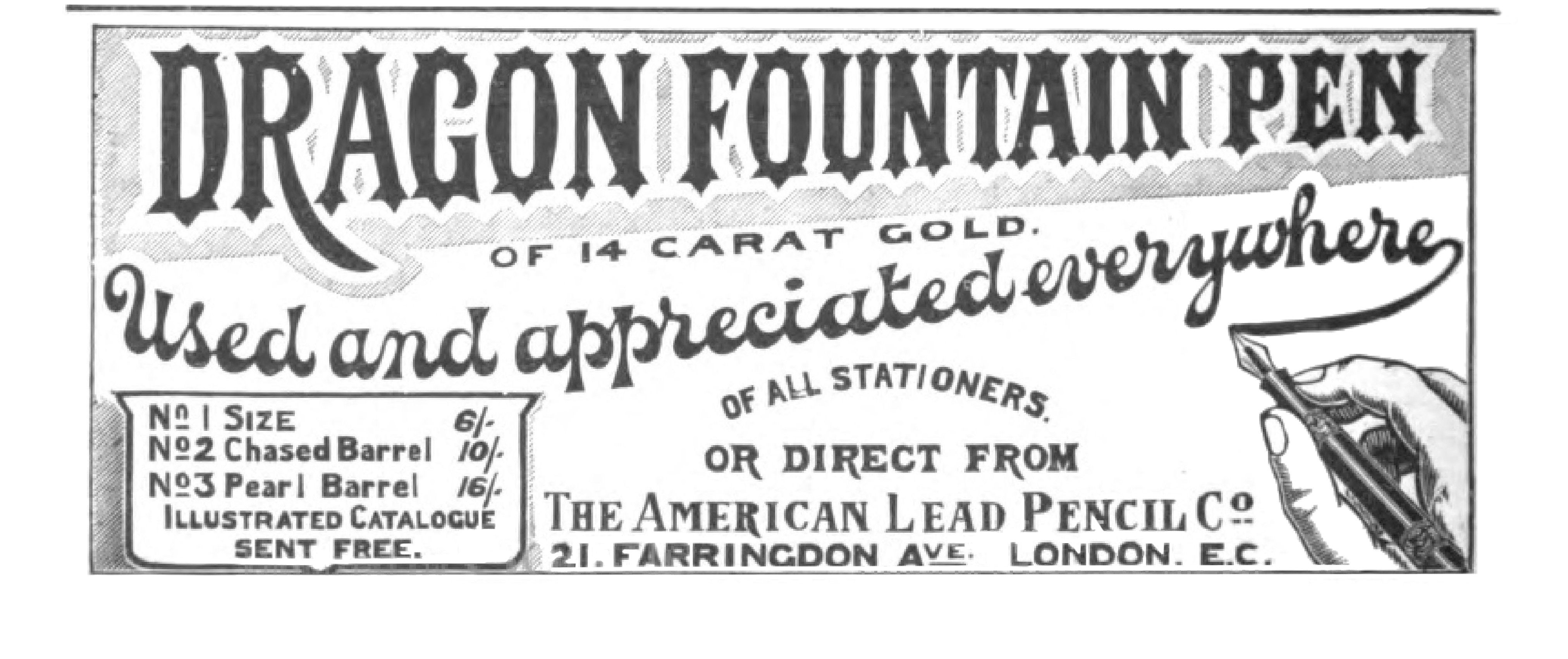 Scanning of advertising from Venus dated 1901. Published on: The Strand Magazine - An Illustrated Monthly, vol. XXI (Jan-Jun), pag. xlii. Refers to the company as: "The American Pencil Co.". Mention as address: "21, Farringdon Avenue, London". Dating established by finding the page in an archived version of the magazine. First half of the year. Advertising for a pen called Dragon Fountain Pen. Mention the establishement of the company on 1860.