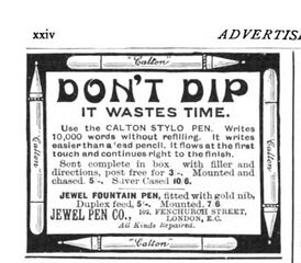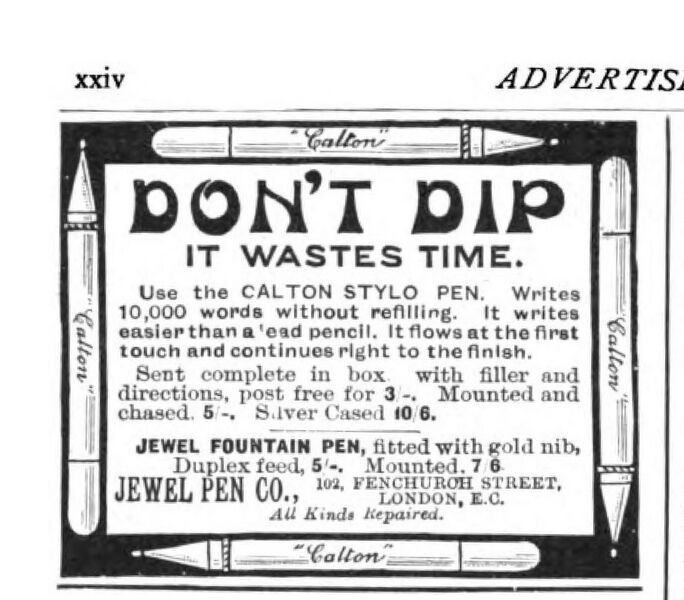 Scansione di una pubblicità Jewel Pen Co. datata 1902. Pubblicazione su: The Strand Magazine - An Illustrated Monthly, vol. XXIII (Jan-Jun), pag. xxiv. Riferimento all'azienda come: "Jewel Pen Co.". Indica come indirizzo: "102, Fenchurch Street, London, E.C.". Data dal reperimento della pagina su una versione archiviata della rivista. Prima metà dell'anno. Pubblicità per una penna a stilo denominata "Calton Stylographic Pen". Cita la Jewel Fountain Pen.