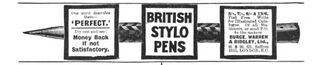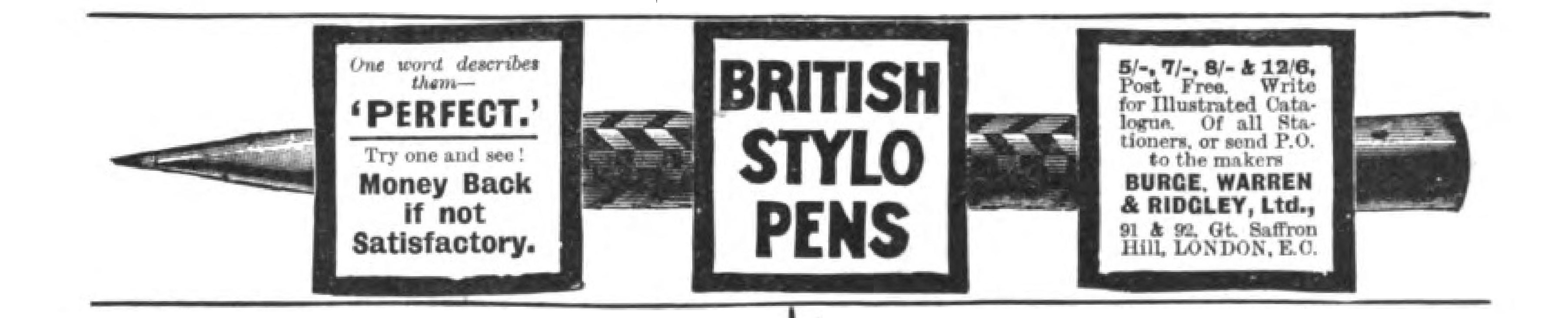 Scanning of advertising from Neptune dated 1902. Published on: The Strand Magazine - An Illustrated Monthly, vol. XXIV (Jul-Dec), pag. lxix. Refers to the company as: "Burge, Warren & Ridgley". Mention as address: "91 & 92, Great Saffron Hill, London, E.C.". Dating established by finding the page in an archived version of the magazine. Second half of the year. Advertising for stylus pens called British Stylo Pens