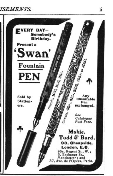 Scansione di una pubblicità Swan datata 1902. Pubblicazione su: The Strand Magazine - An Illustrated Monthly, vol. XXIII (Jan-Jun), pag. li. Riferimento all'azienda come: "Mabie, Todd, & Bard". Indica come indirizzo: "95a, Regent St. W.; 93, Cheapside, London, E.C". Data dal reperimento della pagina su una versione archiviata della rivista. Prima metà dell'anno. Pubblicità per una stilografica Swan Fountain Pen, indica le semplici prezzate 10/6, 16/6 e 25/- e le decorate 40/-, 42/-, 52/6, 104/- fino a £20.