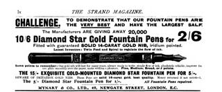 Scanning of advertising from Diamond Star dated 1904. Published on: The Strand Magazine - An Illustrated Monthly, vol. XXVIII (Jul-Dec), pag. lx. Refers to the company as: "Mynart & Co. Ltd.". Mention as address: "49, Newgate Street, London, E. C.". Dating established by finding the page in an archived version of the magazine. Second half of the year. Advertising for some Diamond Star models with gold nib (with medium, broad e J points).