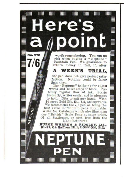 Scansione di una pubblicità Neptune datata 1906. Pubblicazione su: The Strand Magazine - An Illustrated Monthly, vol. XXXI (Jan-Jun), pag. 42. Riferimento all'azienda come: "Burge, Warren & Ridgley Ltd.". Indica come indirizzo: "Great Saffron Hill, London, E.C.". Data dal reperimento della pagina su una versione archiviata della rivista. Prima metà dell'anno. Pubblicità per delle stilografiche chiamate "Neptune".