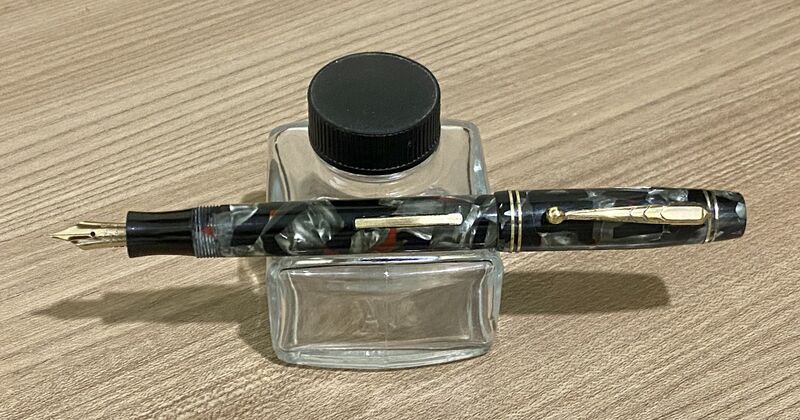 Photo of a pen produced by Parker. Model: Parkette. Filling system: lever filler. In red veined gray marbled celluloid. Type 1, made in USA, 14K gold nib.