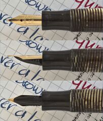 Photo of a pen produced by Helios marked "Helios - Silga". Filling system: piston filler. In ringed green celluloid. Detail of nib. Detail of feeder. Unidentified model, resembling Vacumatic, from italian production by Silga, substituted nib.