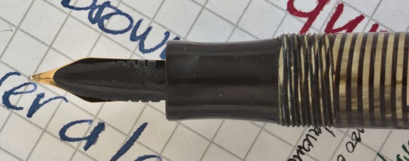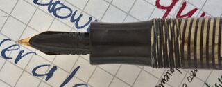 Photo of a pen produced by Helios marked "Helios - Silga". Filling system: piston filler. In ringed green celluloid. Detail of feeder. Unidentified model, resembling Vacumatic, from italian production by Silga, substituted nib.