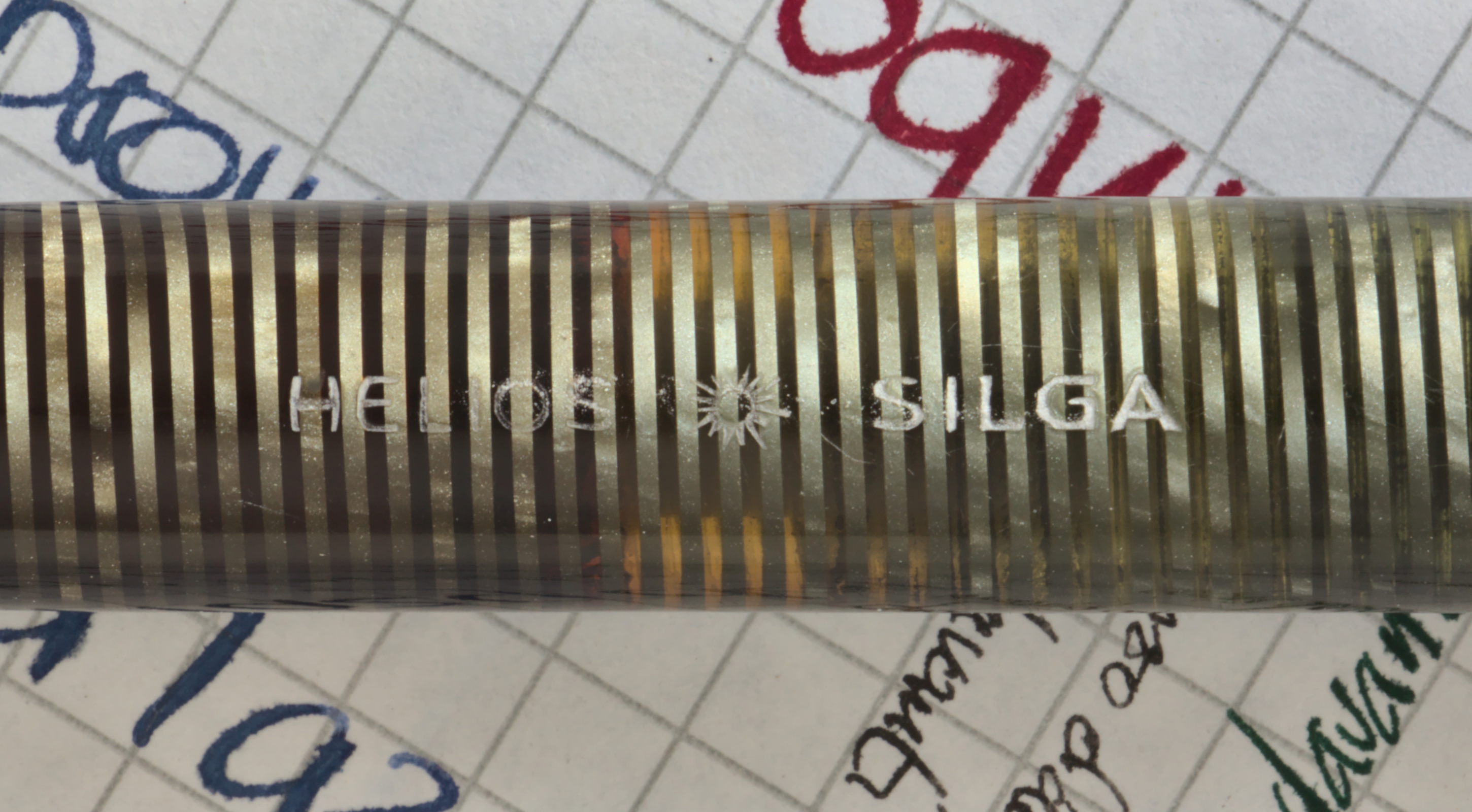Foto di Helios marcata "Helios - Silga". Caricamento a stantuffo. Realizzazione in celluloide anellata verde. Modello non identificato, ispirato a una Vacumatic, riconducibile alla produzione italiana della Silga, pennino di sostituzione.