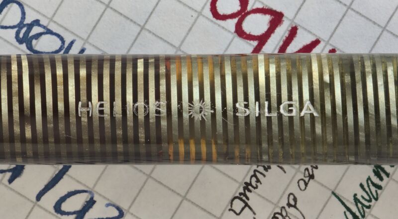 Photo of produced by Helios marked "Helios - Silga". Filling system: piston filler. In ringed green celluloid. Unidentified model, resembling Vacumatic, from italian production by Silga, substituted nib.
