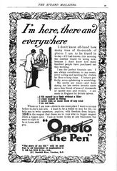 Scanning of advertising from Onoto dated 1908. Published on: The Strand Magazine - An Illustrated Monthly, vol. XXXV (Jan-Jun), pag. 49. Refers to the company as: "Thomas De La Rue & Co., Ltd.". Mention as address: "110, Bunhill Row, E.C.". Dating established by finding the page in an archived version of the magazine. First half of the year. Advertising for the first fountain pens branded Onoto.