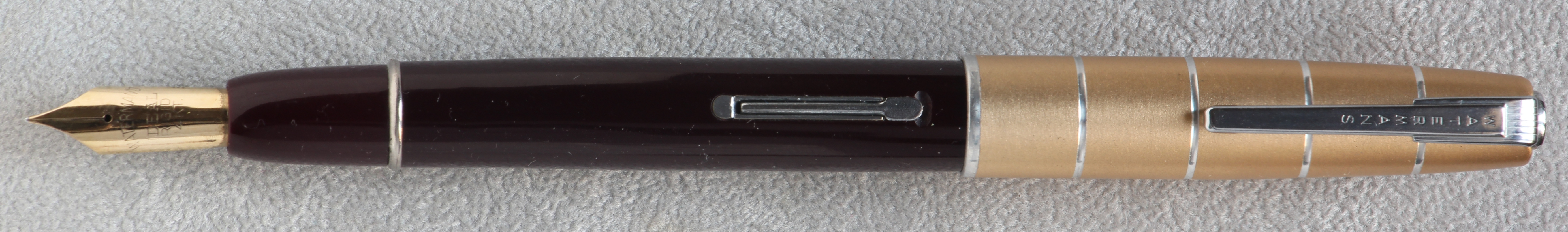 Foto di una penna Waterman. Modello: Crusader. Caricamento a levetta. Realizzazione in resina plastica borgogna (colore "Red"). Seconda versione del modello. Variante "Standard" a pennino aperto, modello identificato dal cappuccio. Pennino speciale marcato "RIGID".
