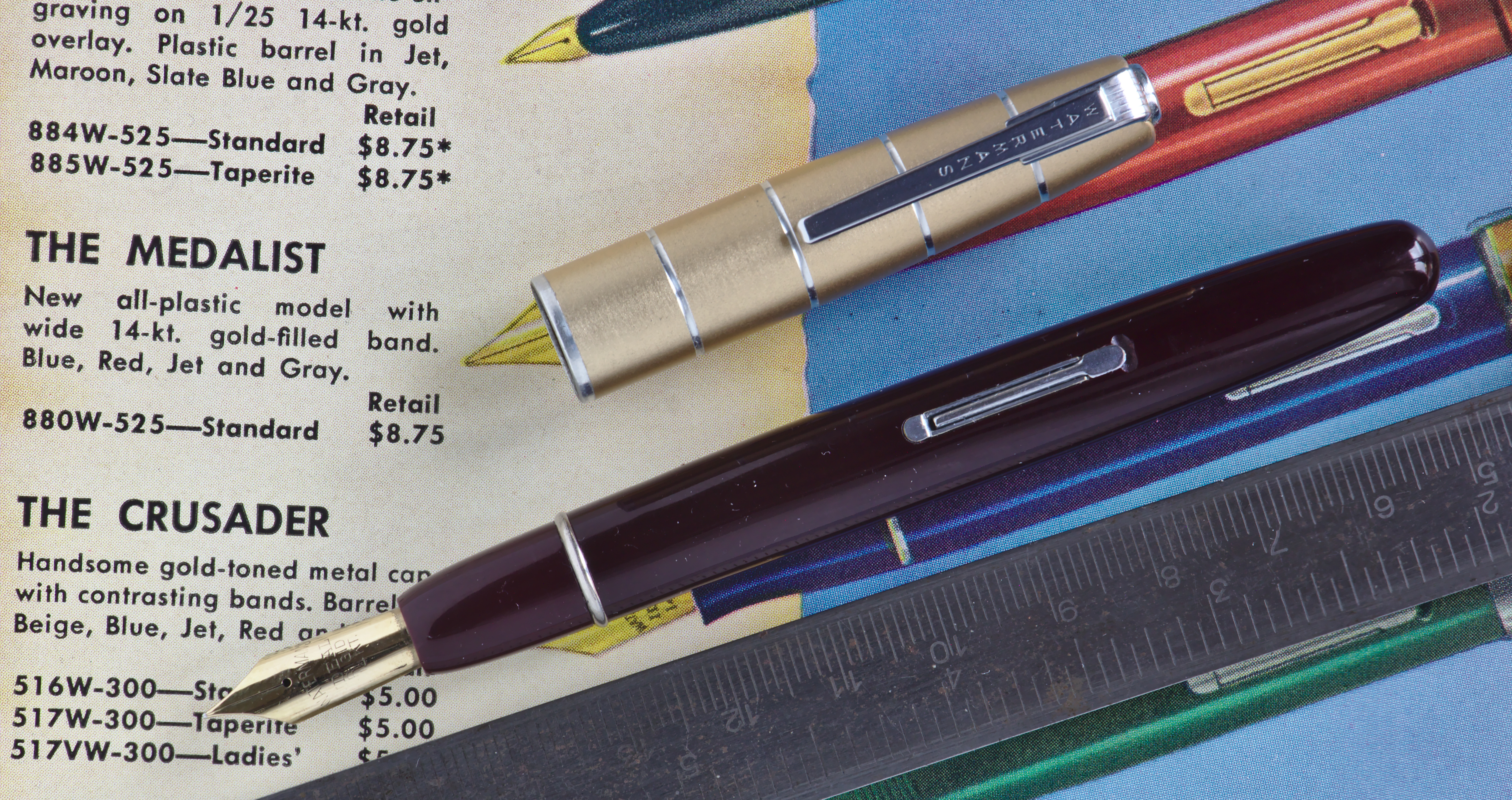 Photo of a pen produced by Waterman. Model: Crusader. Filling system: lever filler. In burgundy ("Red" color) plastic resin. First instance of the model. "Standard" version with open nib, model identified by the cap. Special nib marked "RIGID".