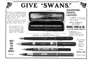 Scansione di una pubblicità Swan datata 1908-12-12. Pubblicazione su: The Illustrated London News, vol. CXXXIII, n. 3634, pag. 850. Riferimento all'azienda come: "Mabie, Todd & Bard". Indica come indirizzo: "79 & 80, High Holborn, W.C". Data dal reperimento della pagina su una versione archiviata della rivista. Pubblicità per una serie di modelli The Swan Pen con caricamento a contagocce e alimentatore overfeed, mostra modelli con decorazioni e rivestiti e cita le dimensioni 1, 2, 4 (numerata 4872 MED) e 5.