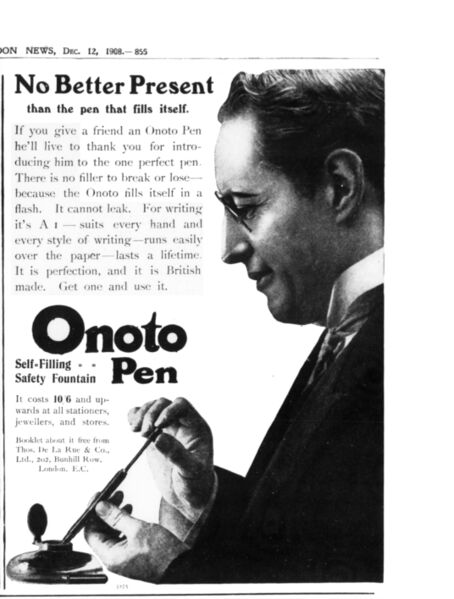 Scanning of advertising from Onoto dated 1908-12-12. Published on: The Illustrated London News, vol. CXXXIII, n. 3634, pag. 855. Refers to the company as: "Thomas De La Rue & Co., Ltd.". Mention as address: "202, Bunhill Row, London, E.C.". Dating established by finding the page in an archived version of the magazine. Advertising for the first fountain pens branded Onoto.