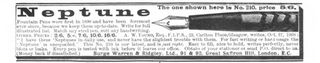 Scanning of advertising from Neptune dated 1909. Published on: The Strand Magazine - An Illustrated Monthly, vol. XXXVIII (Jul-Dec), pag. 25. Refers to the company as: "Burge, Warren & Ridgley Ltd.". Mention as address: "91 & 92, Great Saffron Hill, London, E.C.". Dating established by finding the page in an archived version of the magazine. Second half of the year. Advertising for fountain pens, showing one called "Neptune 220". Mention the production of Neptune as started in 1890.