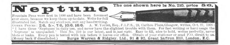 Scansione di una pubblicità Neptune datata 1909. Pubblicazione su: The Strand Magazine - An Illustrated Monthly, vol. XXXVIII (Jul-Dec), pag. 25. Riferimento all'azienda come: "Burge, Warren & Ridgley Ltd.". Indica come indirizzo: "91 & 92, Great Saffron Hill, London, E.C.". Data dal reperimento della pagina su una versione archiviata della rivista. Seconda metà dell'anno. Pubblicità per delle stilografiche, ne mostra una chiamata "Neptune 220". Riporta la produzione delle penne Neptune dal 1890.