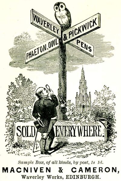 Scanning of advertising from Cameron dated 1889-08-24. Published on: The Illustrated London News, vol. XCV, n. 2627, pag. 258. Refers to the company as: "Macniven & Cameron". Mention as address: "Waverley works, Edimburgh". Dating established by finding the page in an archived version of the magazine. Published also on: vol. XCVI, n. 2656 (1890-03-15), p. 351; vol. XCVI, n. 2660 (1890-04-12), p. 479. A generic advertising, mention the "Waverley Pens".