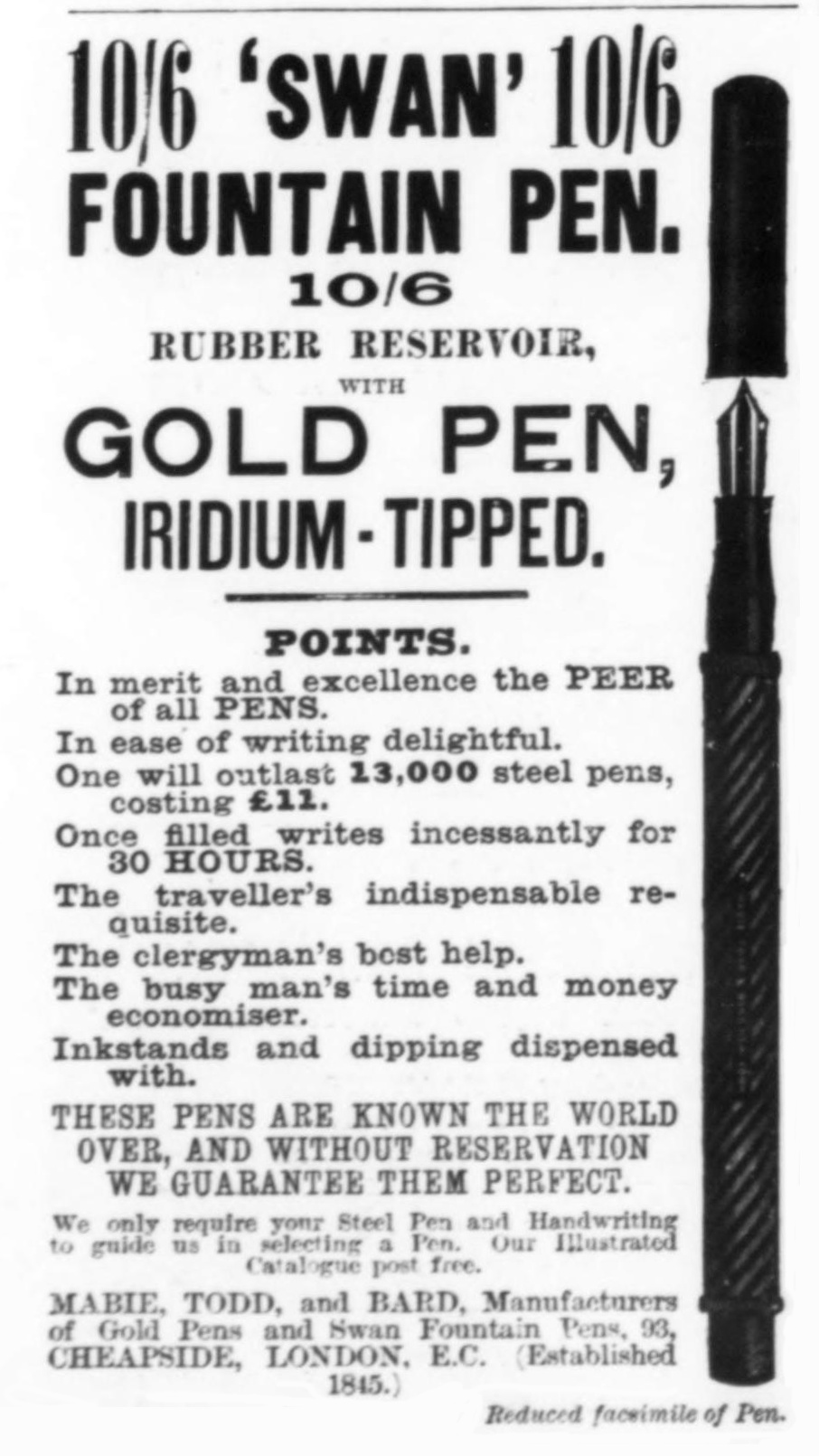 Scanning of advertising from Swan dated 1893-02-25. Published on: The Illustrated London News, vol. CII, n. 2810, pag. 258. Refers to the company as: "Mabie, Todd, & Bard". Mention as address: "93, Cheapside London E.C.". Dating established by finding the page in an archived version of the magazine. Advertising for a Swan Fountain Pen fountain pen priced 10/6.