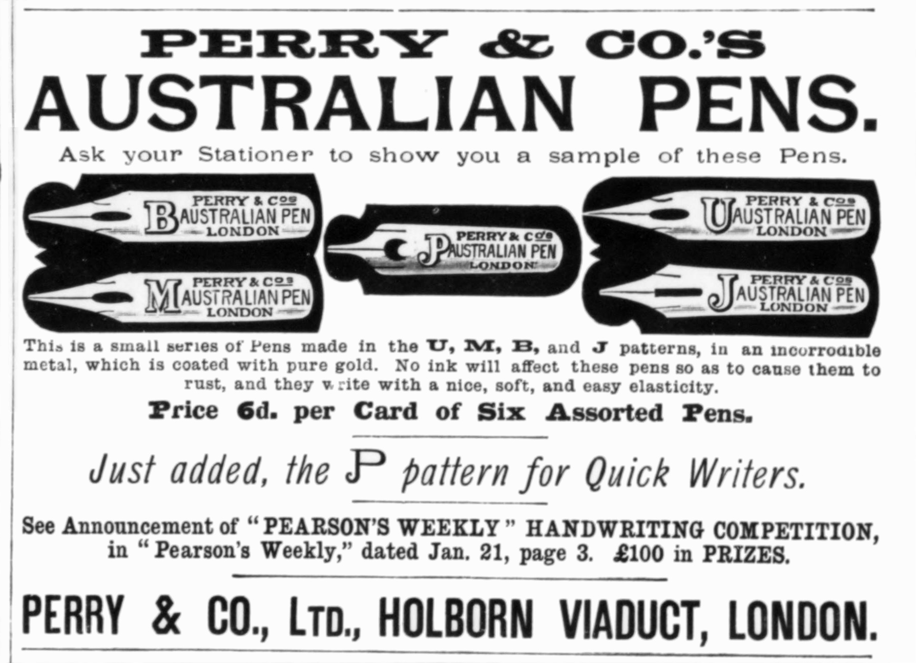 Scansione di una pubblicità Perry datata 1893-01-14. Pubblicazione su: The Illustrated London News, vol. CII, n. 2804, pag. 58. Riferimento all'azienda come: "Perry & Co. Ltd.". Indica come indirizzo: "Holborn Viaduct, London". Data dal reperimento della pagina su una versione archiviata della rivista. Pubblicata anche su: vol. CII, n. 2807 (1893-02-04), p. 164. Pubblicizza dei pennini fra cui un J nib.