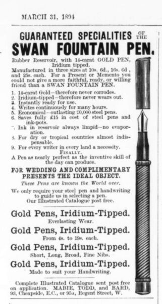 Scansione di una pubblicità Swan datata 1894-03-31. Pubblicazione su: The Illustrated London News, vol. CIV, n. 2867, pag. 407. Riferimento all'azienda come: "Mabie, Todd, & Bard". Indica come indirizzo: "93, Cheapside E.C.". Data dal reperimento della pagina su una versione archiviata della rivista. Pubblicata anche su: vol. CIV, n. 2869 (1894-04-14), p. 472; vol. CIV, n. 2871 (1894-04-28), p. 536; vol. CIV, n. 2875 (1894-05-26), p. 668; vol. CIV, n. 2879 (1894-06-23), p. 802. Pubblicizza una stilografica Swan Fountain Pen, in tre dimensioni prezzate rispettivamente 10/6, 16/6 e 25/-.