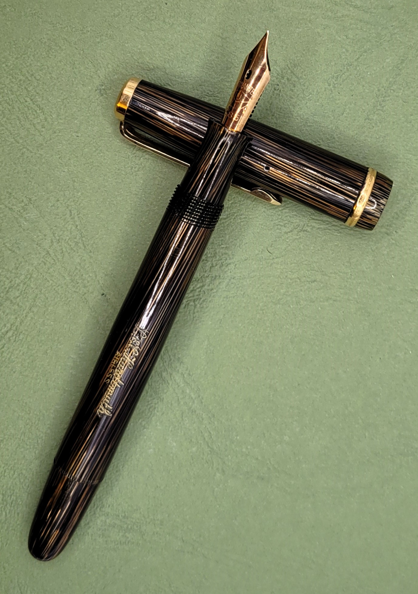 Foto di una penna Hardtmuth. Modello: Airless. Caricamento a stantuffo. Realizzazione in celluloide a righe sottili marroni. Modello marcato Airless, sul fusto. Contributo di Walter (utente forum Wall).