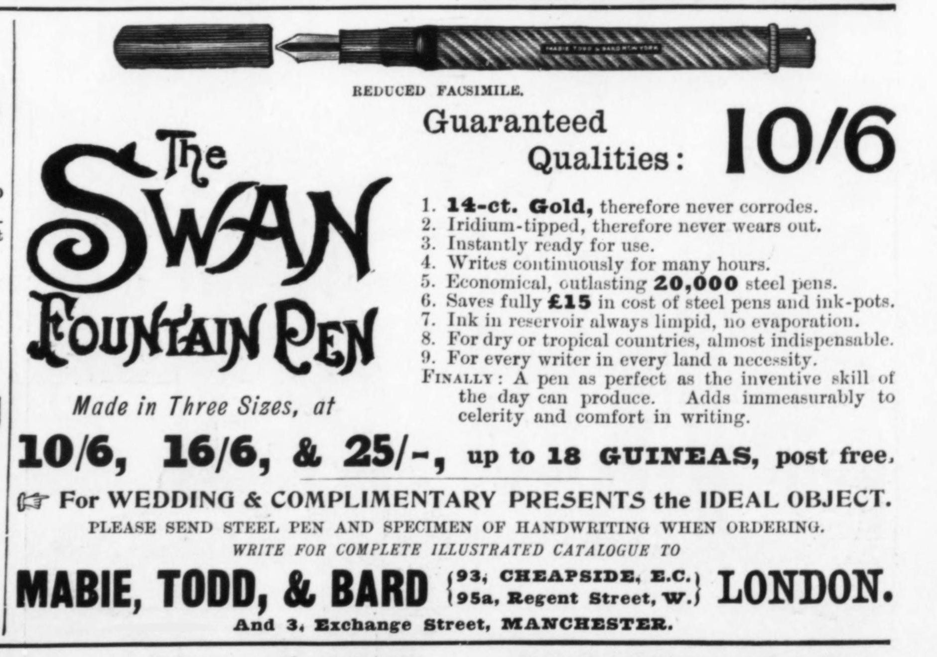 Scanning of advertising from Swan dated 1899-01-14. Published on: The Illustrated London News, vol. CXIV, n. 3117, pag. 68. Refers to the company as: "Mabie, Todd, & Bard". Mention as address: "93, Cheapside London E.C.". Dating established by finding the page in an archived version of the magazine. Advertising for a Swan Fountain Pen fountain pen in three sizes priced respectively 10/6, 16/6 e 25/-.