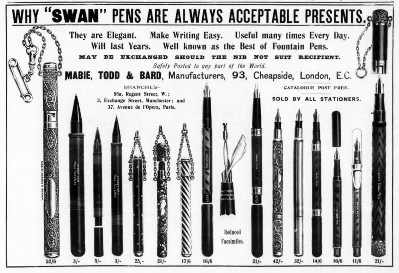 Scansione di una pubblicità Swan datata 1901-11-23. Pubblicazione su: The Illustrated London News, vol. CXIX, n. 3266, pag. 797. Riferimento all'azienda come: "Mabie, Todd, & Bard". Indica come indirizzo: "93, Cheapside, E.C.". Usa lo slogan: "the king of fountain pens". Data dal reperimento della pagina su una versione archiviata della rivista. Pubblicata anche su: vol. CXIX, n. 3270, (1901-12-21), p. 985. Pubblicizza diversi modelli di Swan Pen con caricamento a contagocce e alimentatore overfeed, fra cui i numeri 4662, 4571, 3012 e 3001 (con Swan Clip). Mostra anche delle Chatelaine Swan con catenella e chiusura a baionetta e delle penne a stilo Cygnet.